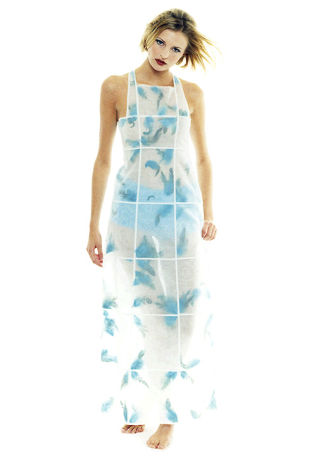 Federn in ihrer Leichtigkeit, den Farben und Strukturen inspirierten mich zu dieser Kollektion. In einen doppelt gefassten transparenten Seidenorganzastoff fein eingenäht, sind die Federn beweglich und schmiegen sich an jede Körperbewegung an.