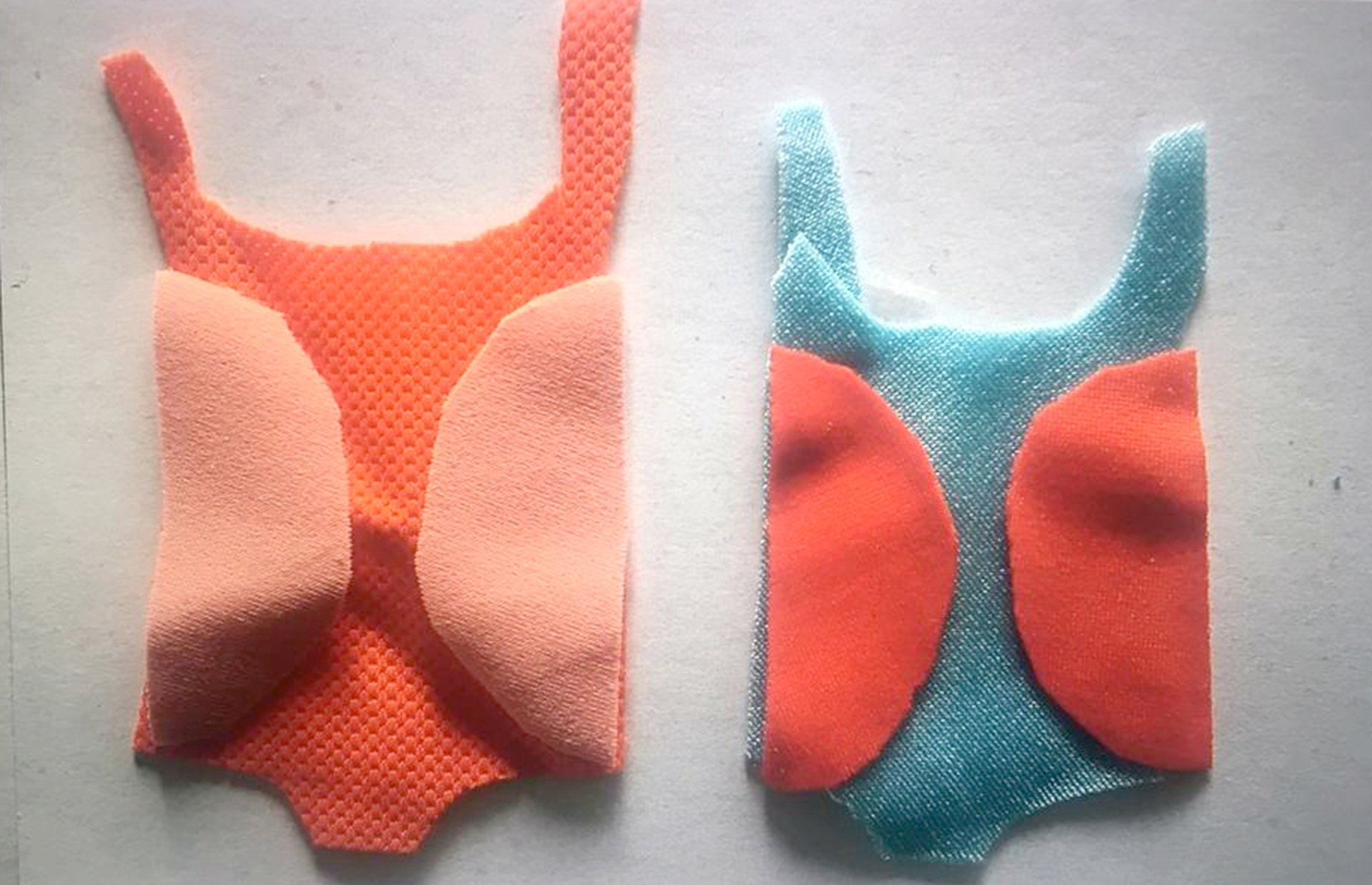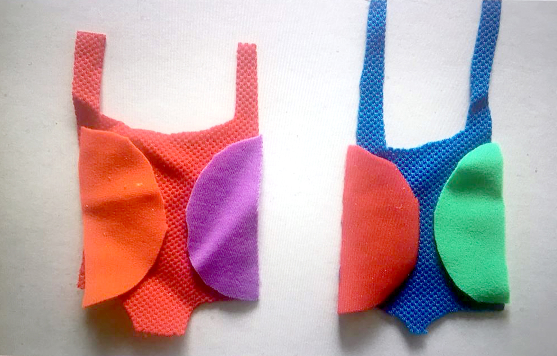 Durch die zwei-und drei farbigen Kreisformen und Farbflächen in meiner Kollektion, sind spannende geometrische Schnittlinien entstanden, die der Figur eine homogene, weibliche Silhouette verleihen.
